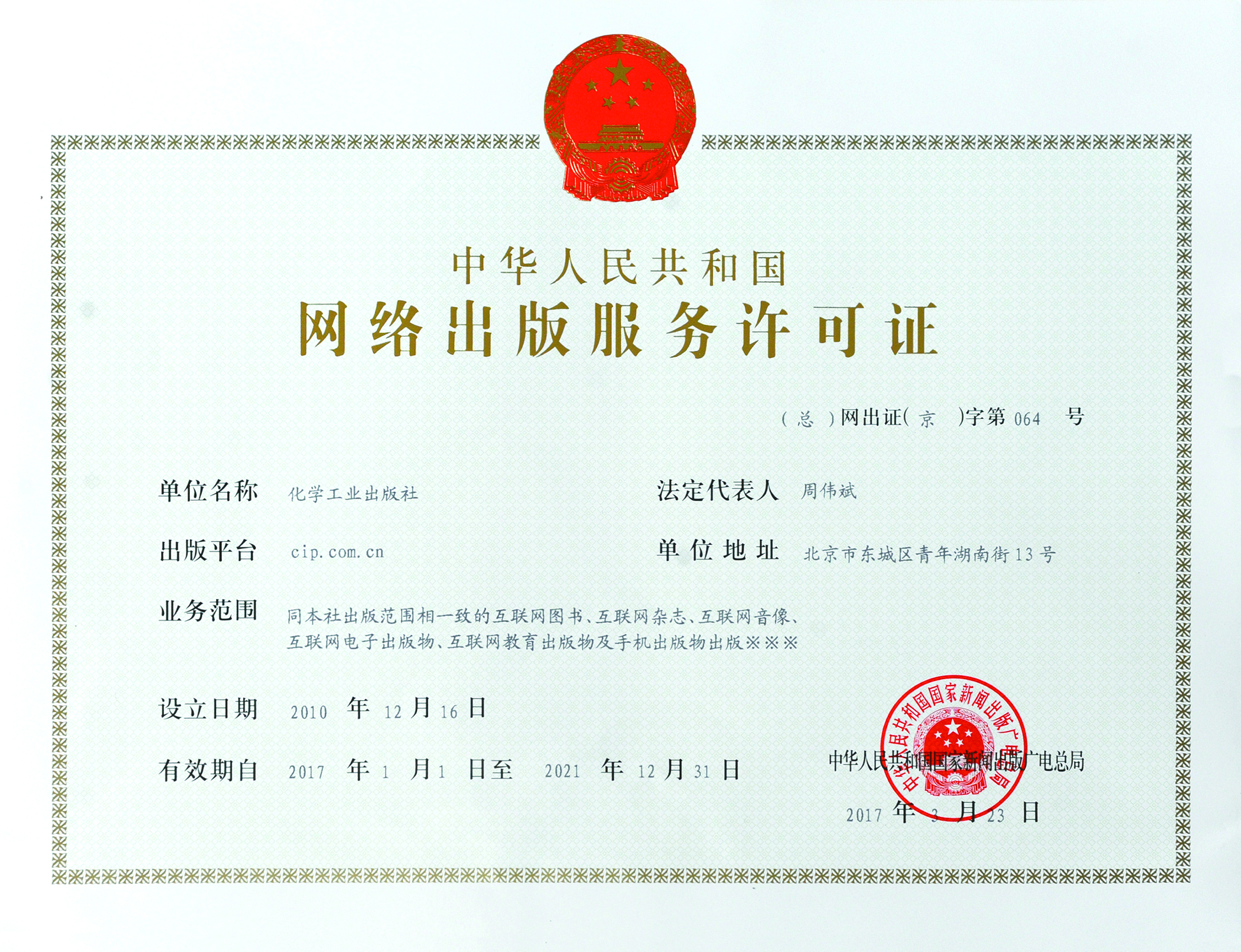 2018 © 化學(xué)工業(yè)出版社有限公司. ALL Rights Reserved. 京ICP備12046843號(hào)-7 | 京公網(wǎng)安備 11010102000557號(hào) | 網(wǎng)絡(luò)出版服務(wù)許可證 | 出版物經(jīng)營(yíng)許可證副本 | 出版物營(yíng)業(yè)執(zhí)照副本